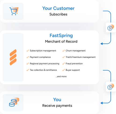 FastSpring’s merchant of record model is a unique service available to sellers of SaaS, software, and digital goods — anywhere in the world. A merchant of record (Like FastSpring!) will process payments, deliver revenue, collect and remit sales taxes, manage your subscriptions, monitor fraud, increase approval rates, keep you compliant, and respond to any audits related to sales taxes or VAT — so you don’t have to.